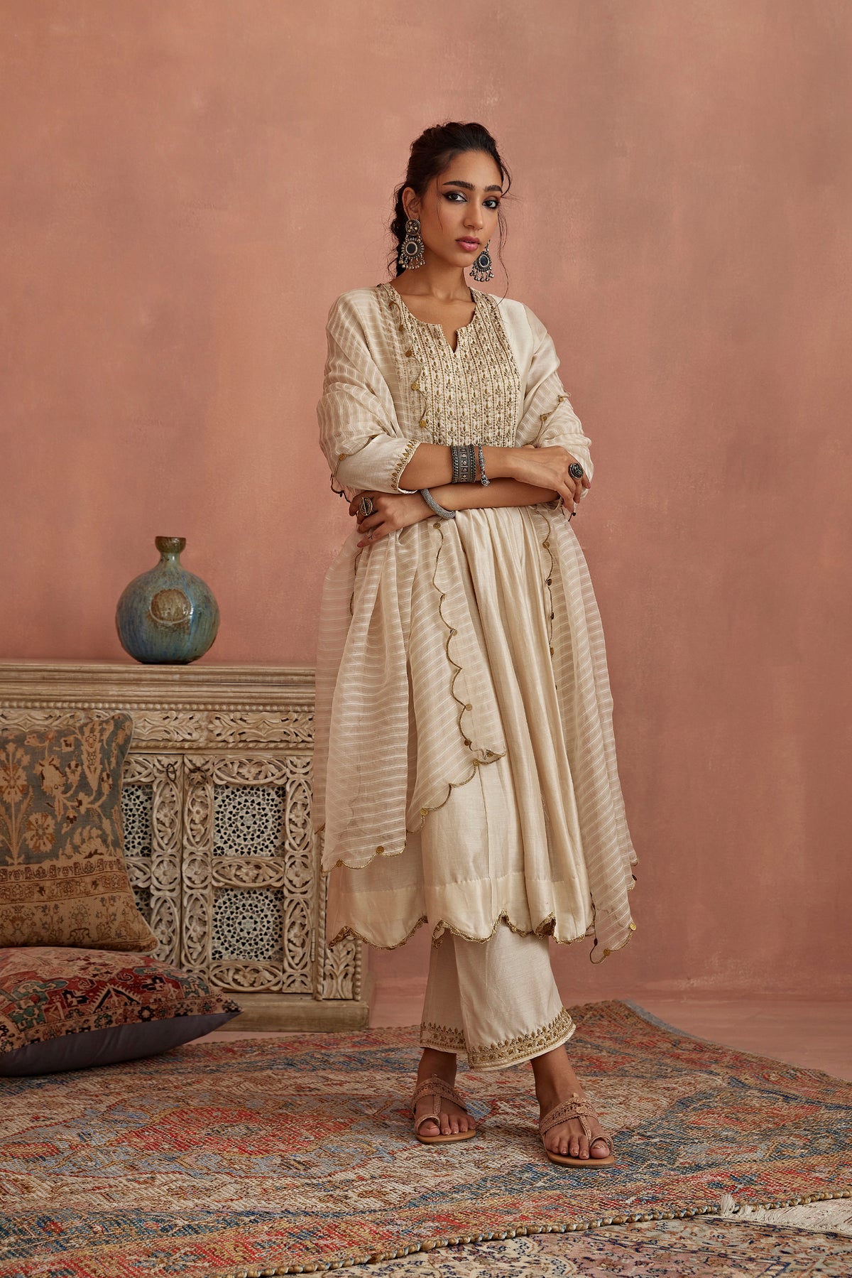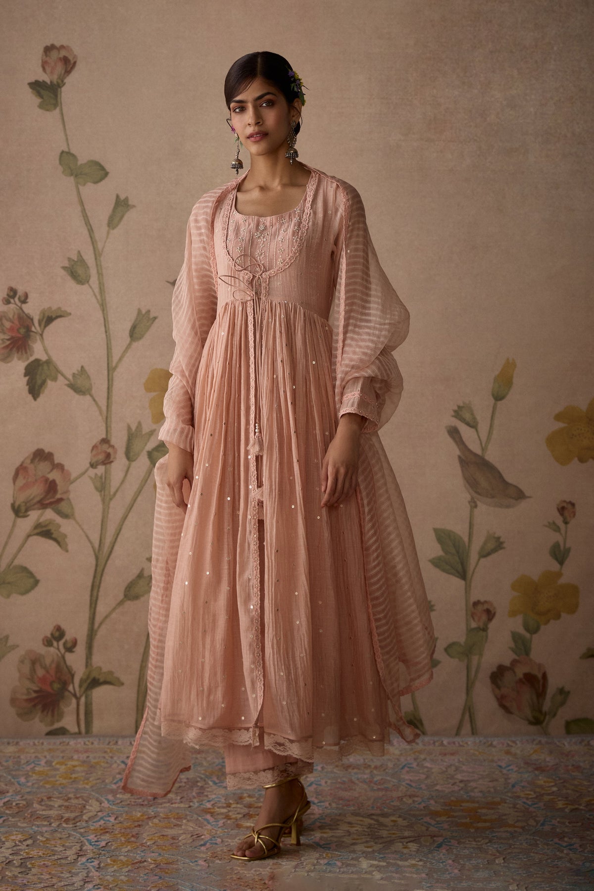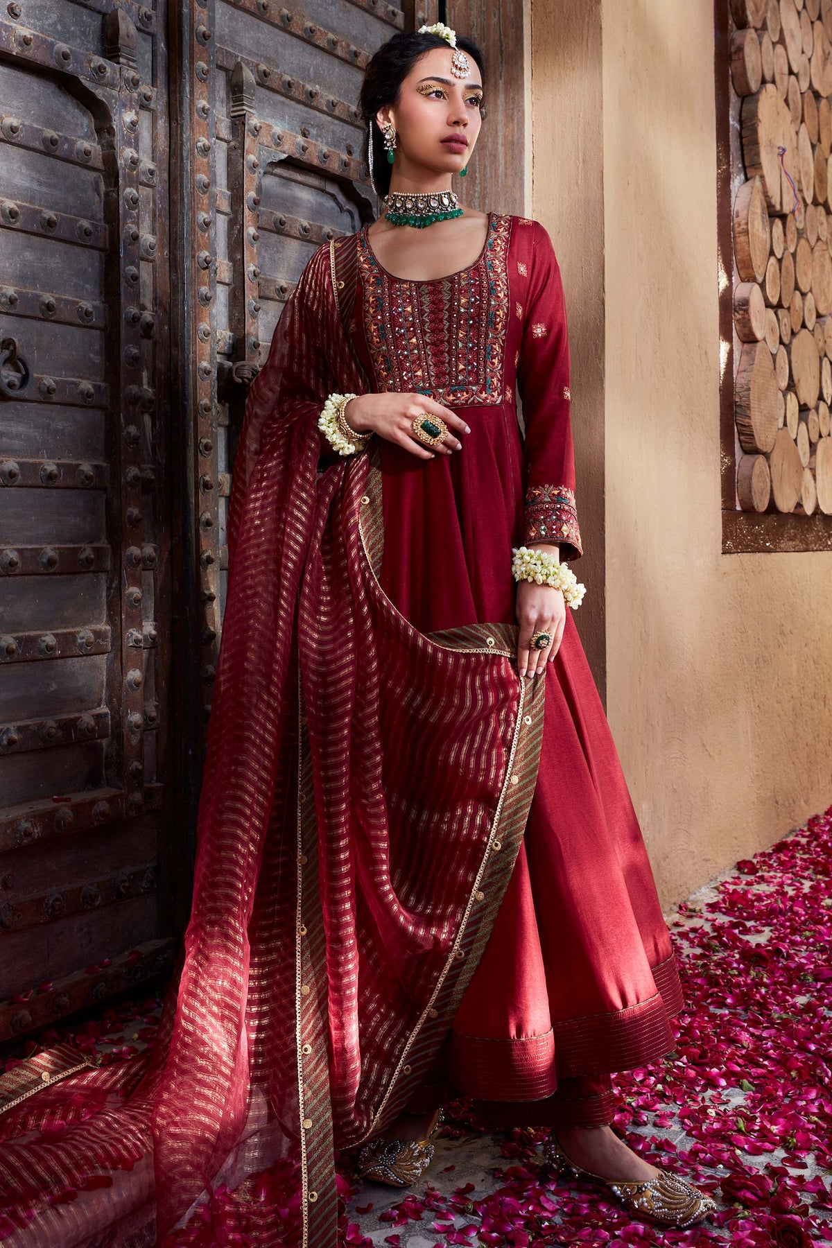 If you are attending a wedding as a guest, consider an Anarkali suit for wedding party. Lighter fabrics like georgette or chiffon are perfect for these events, as they allow ease of movement, especially when you are dancing at the sangeet or mingling with relatives during the reception. Embroidery and embellishments in such Anarkali wedding dresses should be subtle yet striking, keeping your outfit elegant but not too overpowering. For a chic look, opt for chandbali earrings or long danglers. If you prefer a minimalist style, a sleek clutch and bangles will complement the outfit beautifully.