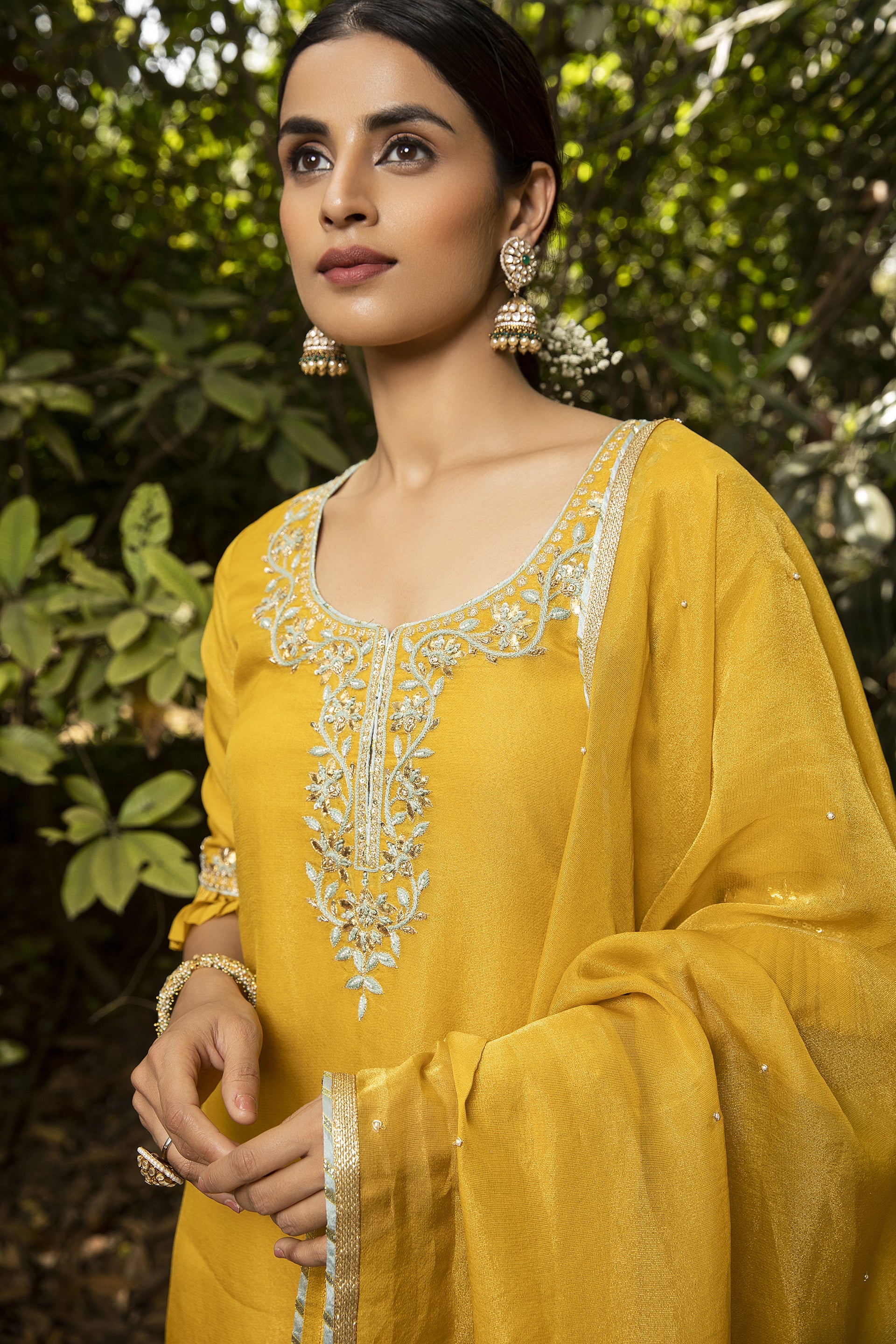 - Jewelry Pairing: Heavy chokers, Kundan jewelry, or polki sets look great with bridal shararas. Guests might choose minimalist maang tikka, statement earrings, or danglers.