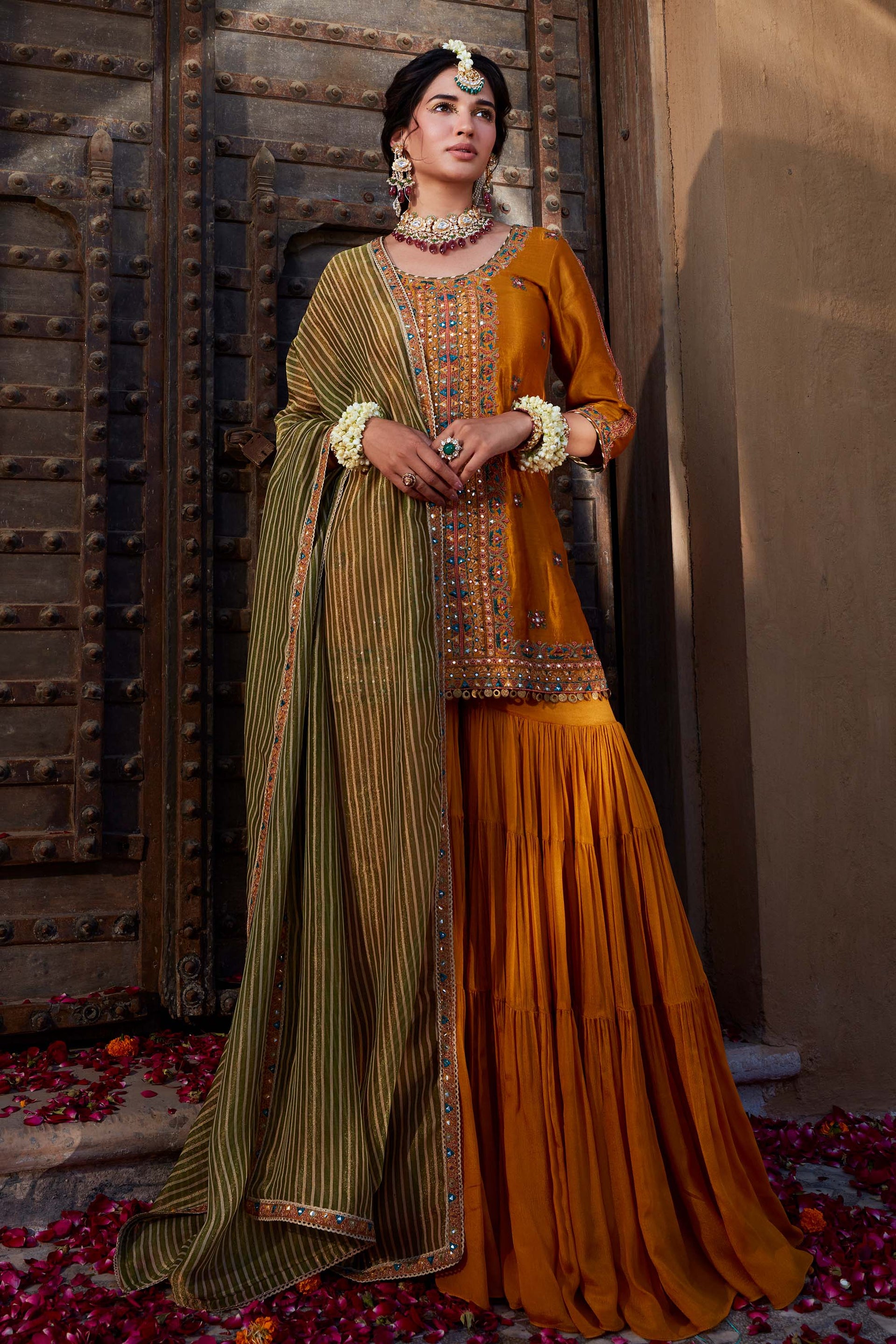 - Footwear Suggestions: Particularly for floor-length shararas, heels add elegance. For extended events where comfort is important, flat juttis or sandals with embellishments are ideal.