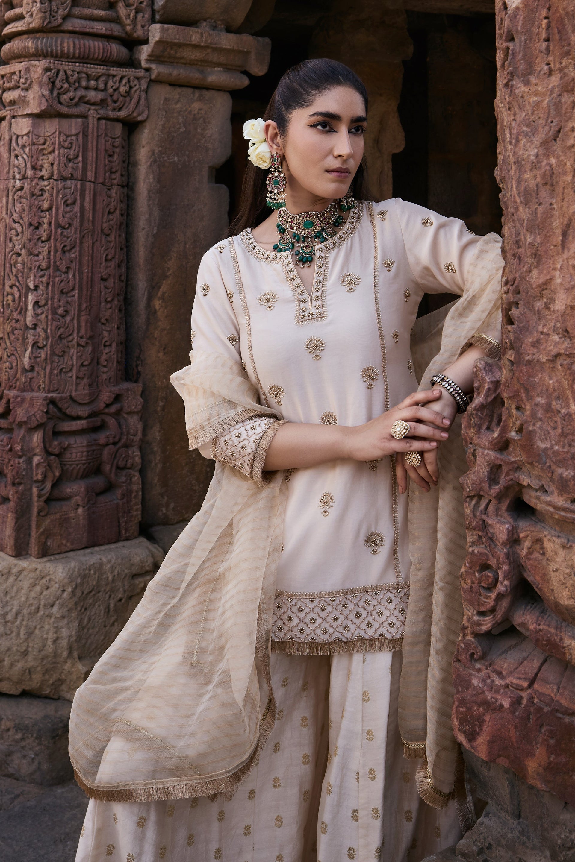 - Style: A kurti and dupatta worn with wide-legged, flared pants.
