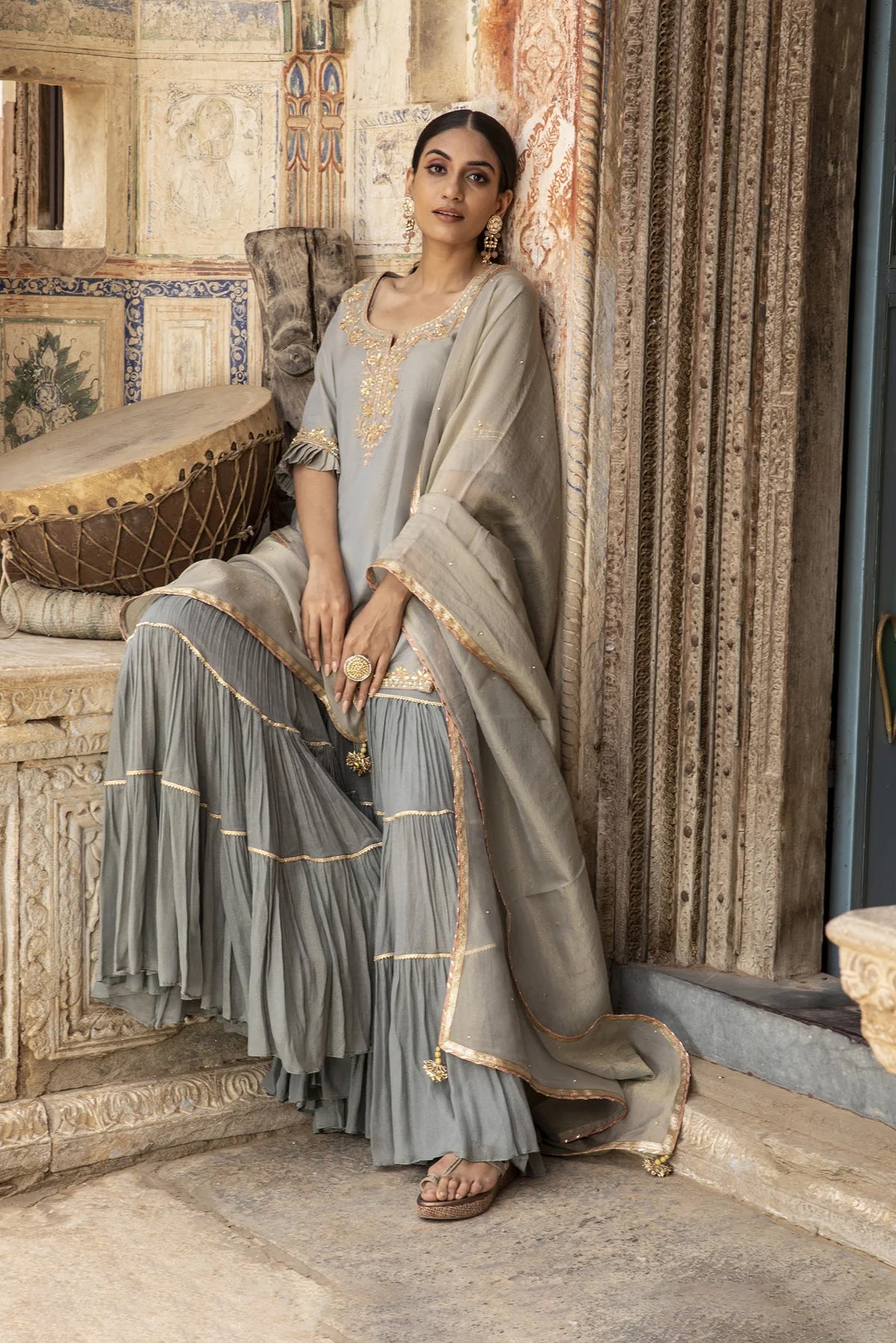 This beautiful grey sharara set is perfect for any wedding occasion. The soft grey color gives a graceful and modern touch, making it a great sharara for wedding events. The design is simple yet elegant, with comfortable fabric and lovely details that make it stand out. Whether you're dressing for a pre-wedding event or the main ceremony, this festive sharara set for celebrations will help you look stunning and feel at ease. The subtle color adds a sense of sophistication, making it an ideal choice for those looking for something unique and elegant.