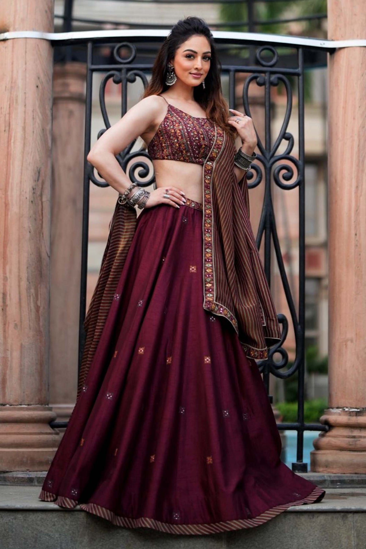 Maroon Multi Thread and Mirror Work Lehenga