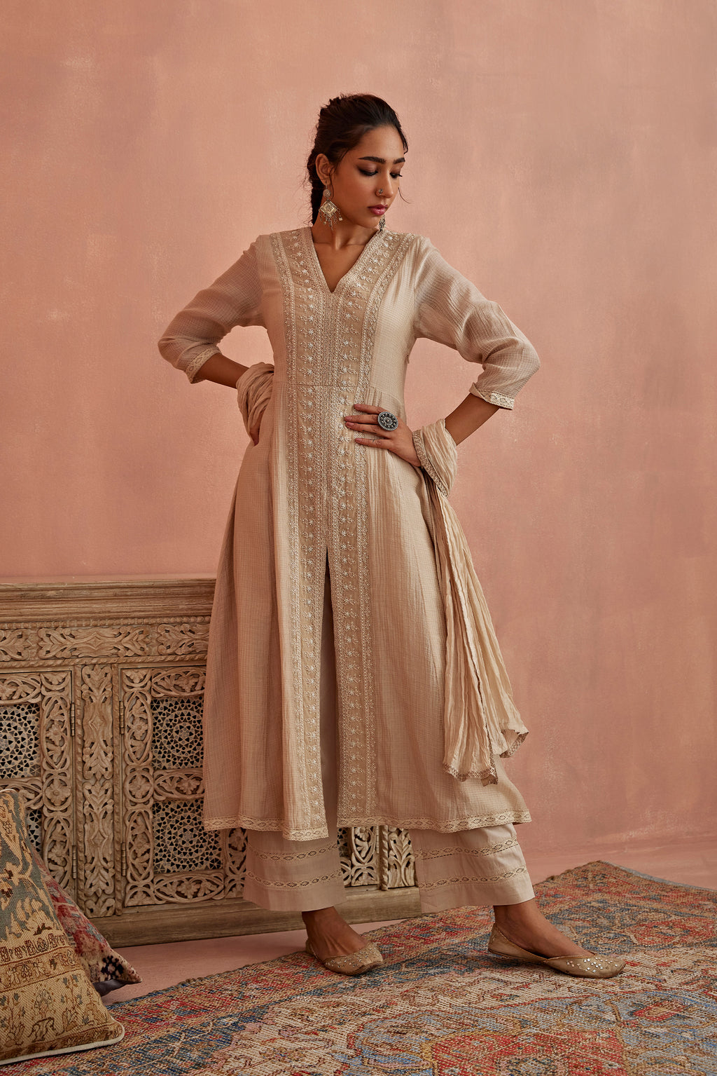 End the festival on a high note with the Ivory Front Open Lace Kurta Set. This elegant ensemble is perfect for a grand finale, offering sophistication and comfort. As a Navratri outfit, it ensures you look stunning on the last Garba night.
