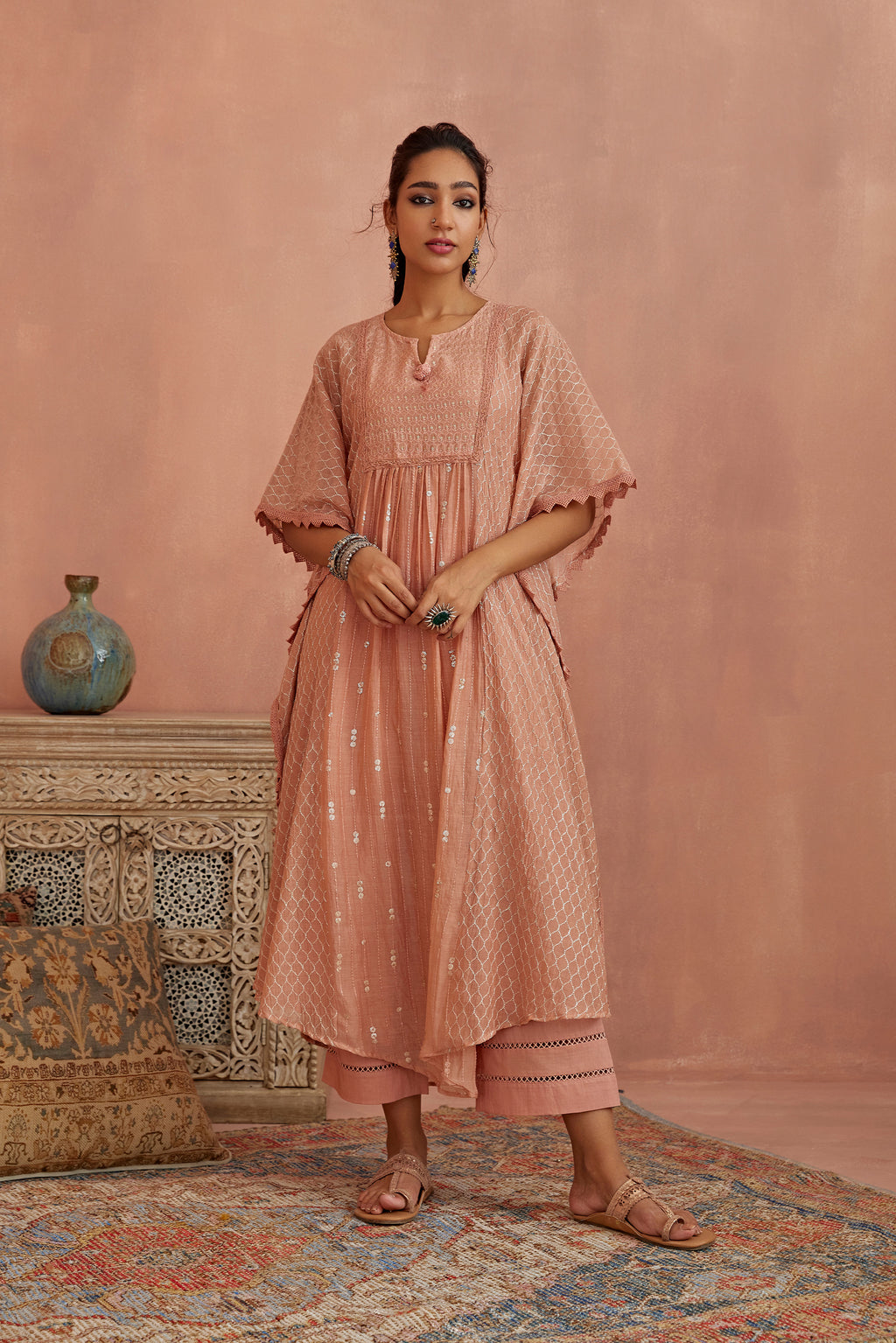 The blush Chanderi kaftan is an effortless and graceful choice for Day 8. Flowing fabrics and delicate tones make it a standout Navratri special dress, ideal for late-night Garba celebrations.