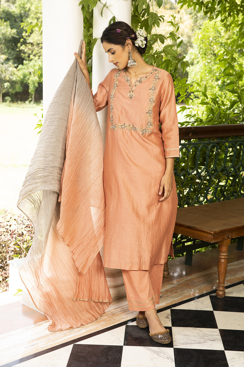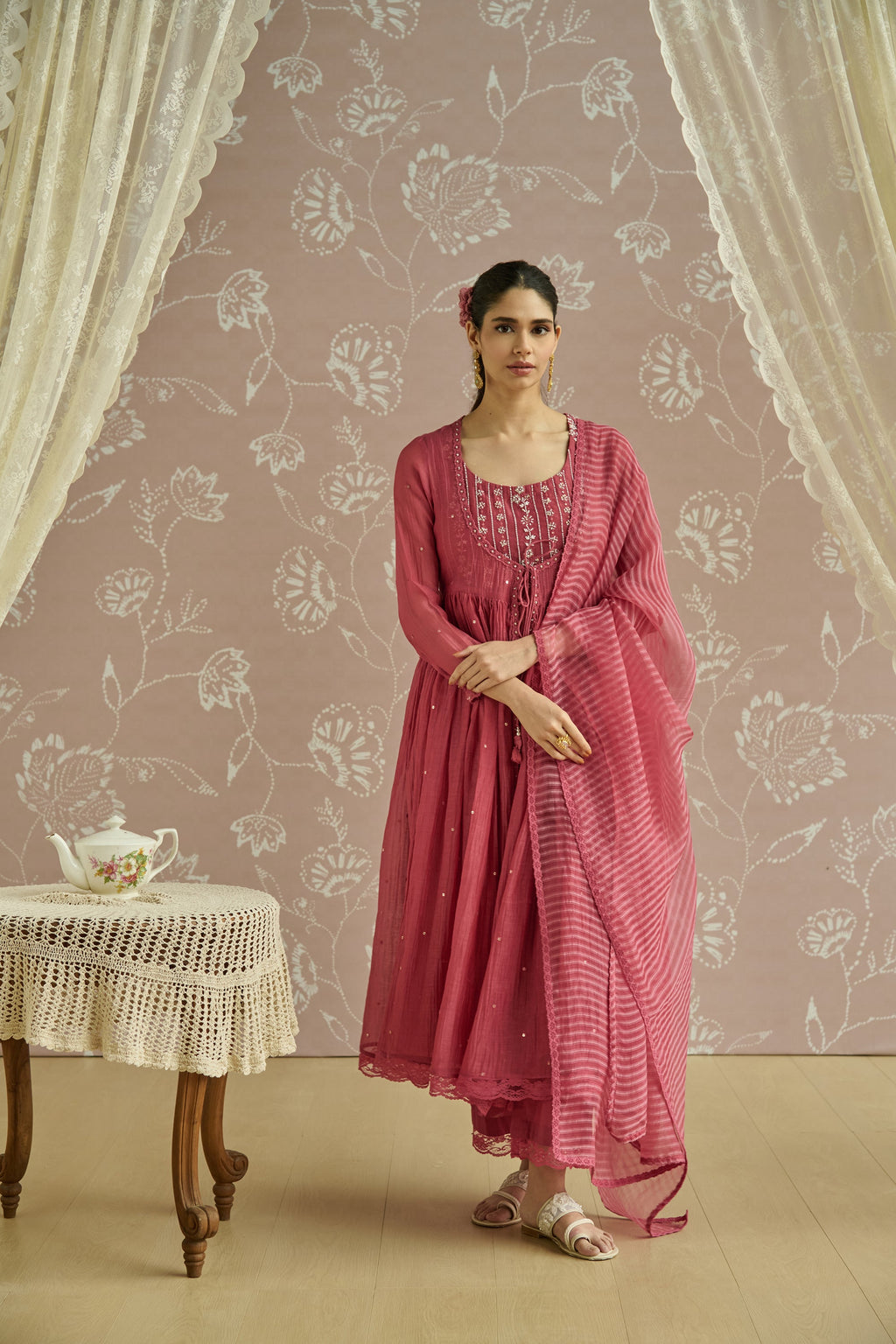 Start your Navratri celebrations with elegance. The coral hand-embroidered Anarkali jacket set brings a soft yet festive appeal. This Navratri special dress is perfect for welcoming the first day with grace.